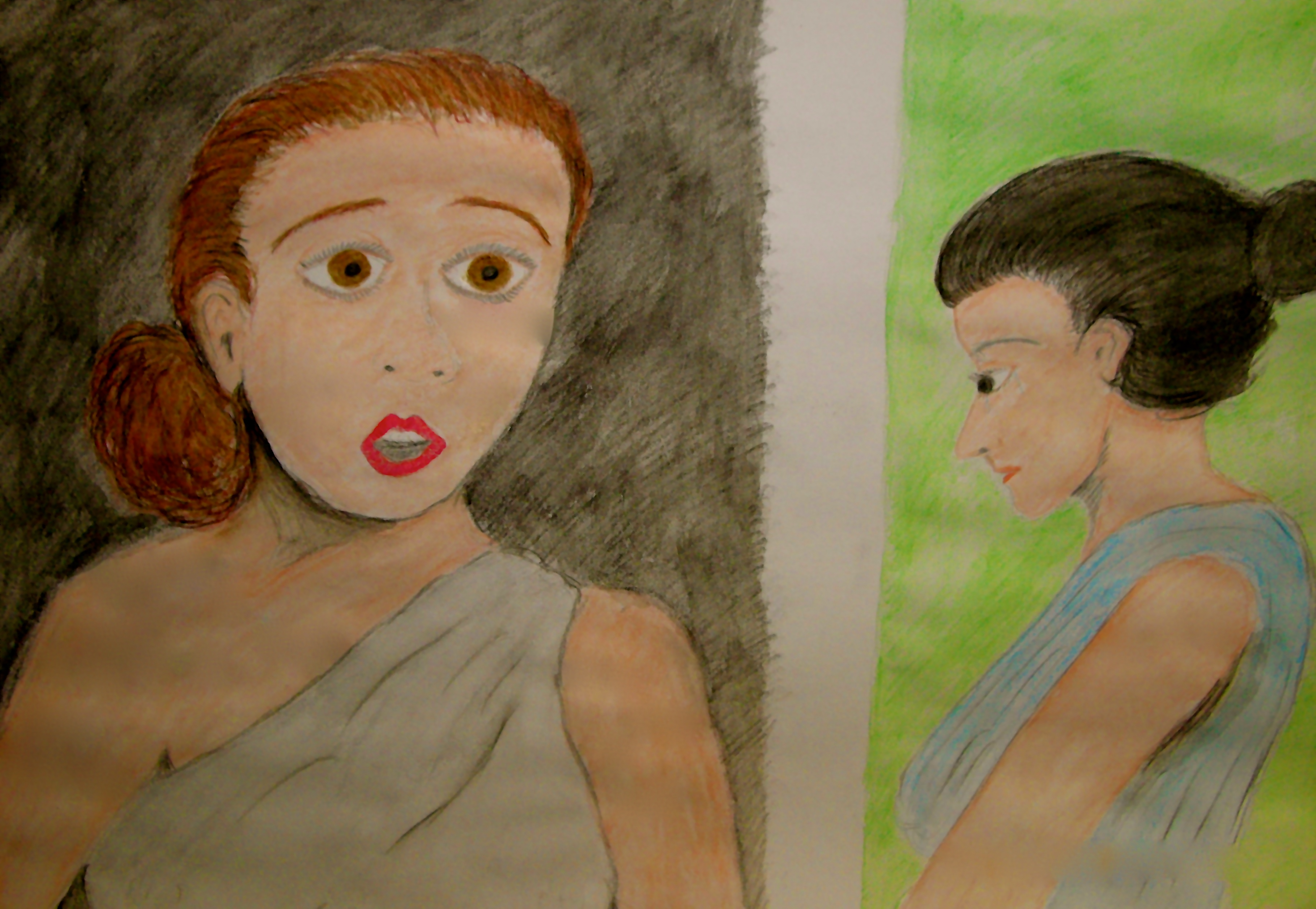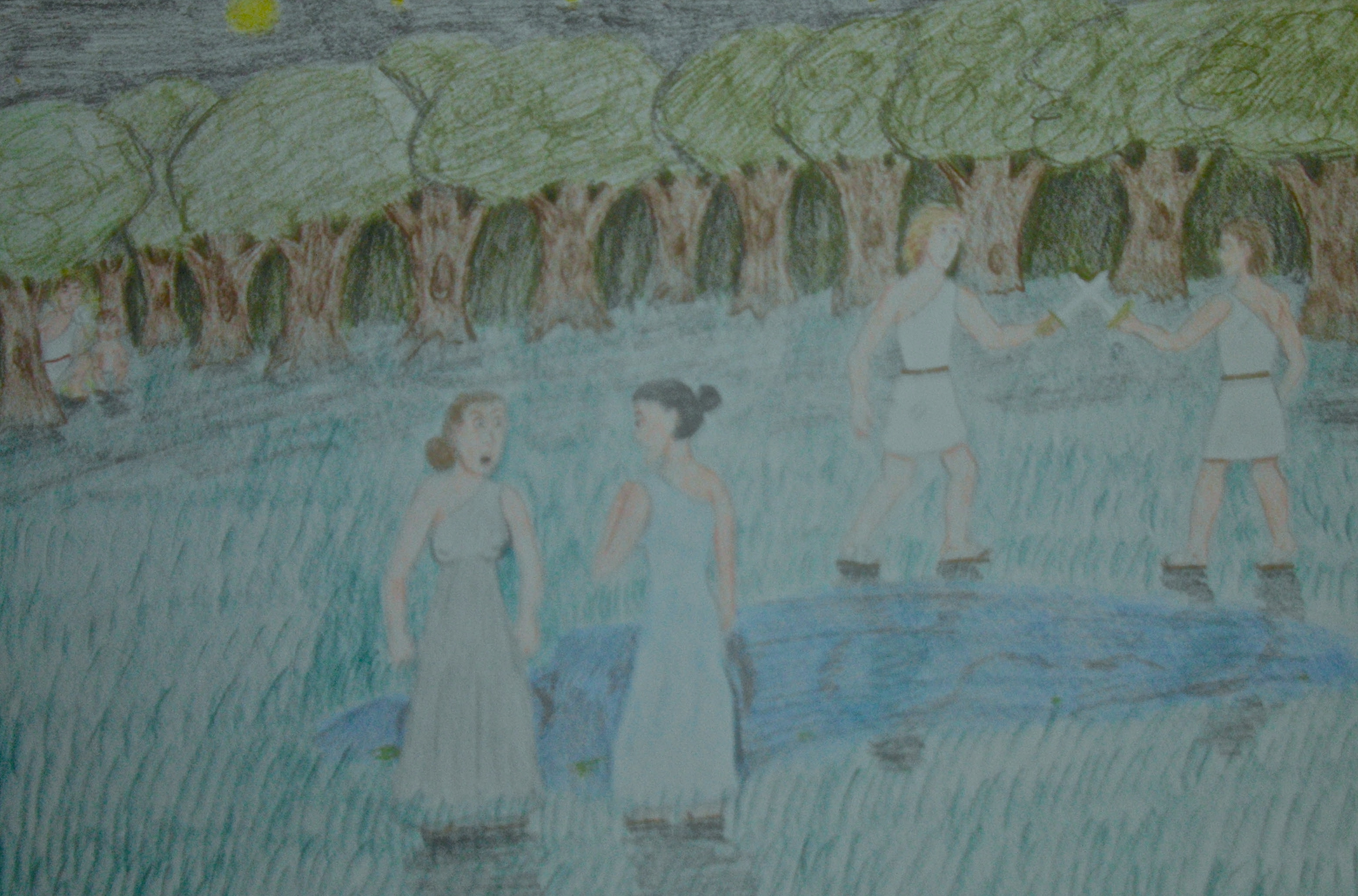 Soon after, Demetrius and Helena walk by that area, Demetrius still scorning her. He leaves her alone, and she looks at her reflection in a pond. Her reflection distorted by the ripples in the water, she sadly concludes, “I’m as ugly as a bear.” Then she sees Lysander sleeping, and worries that he could be dead. She wakes him, and he falls in love with her. Shocked at this sudden change in him, she assumes he is making fun of her. She leaves the area in tears, him pursuing her, and Hermia is left alone there. Later, she wakes from a terrible dream, and, frightened, wonders where Lysander went. She then goes to look for him.
