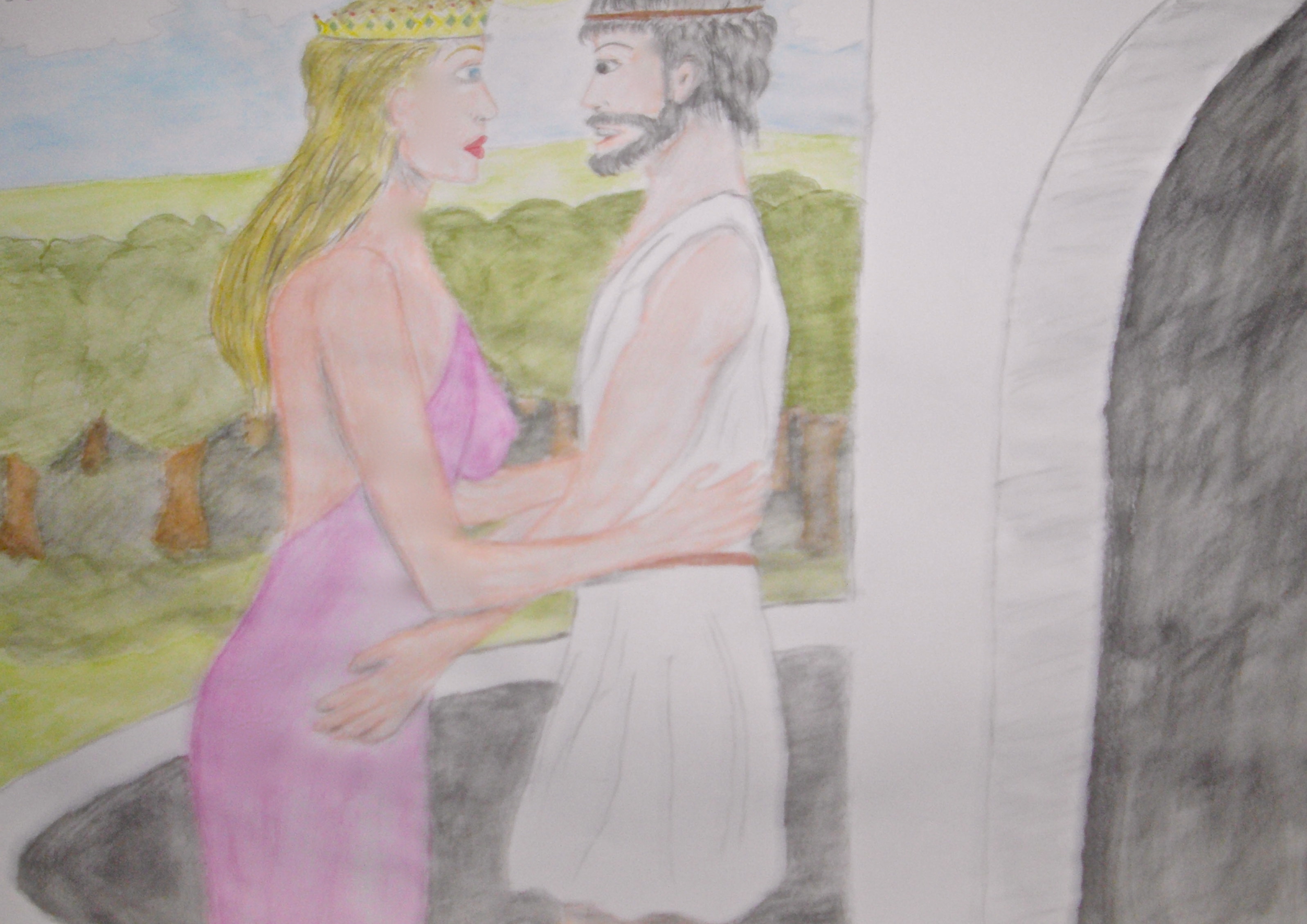 Francis Flute, in women’s clothes, enters as an absurd-looking Thisbe, hoping to speak with Pyramus. They speak to each other briefly, and try to kiss through Wall’s chink, but obviously cannot. Pyramus asks her if she’ll meet him at “Ninny’s Tomb”. She says she will, and they leave. Wall, having finished his part, says good-bye to the audience, and leaves also.