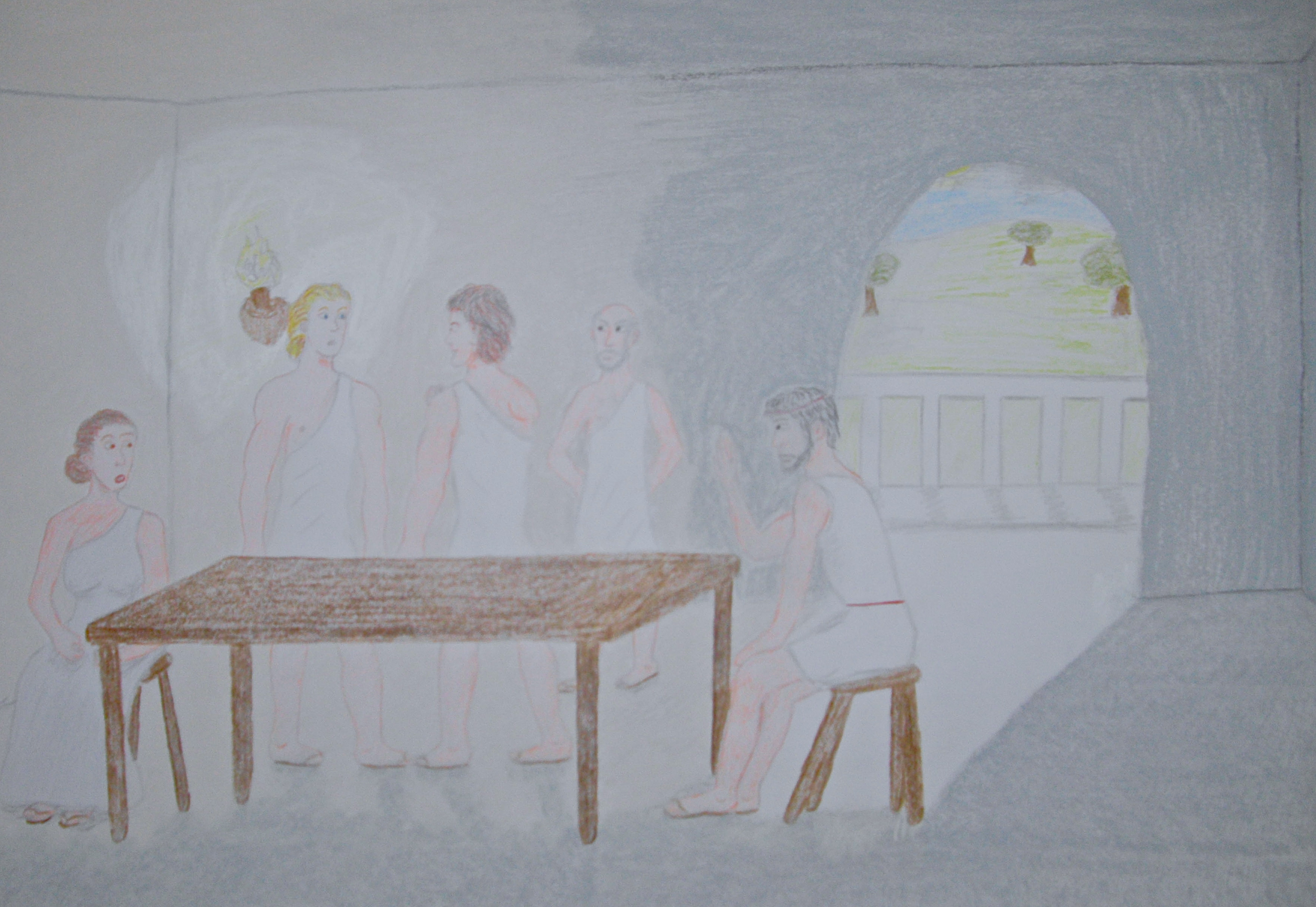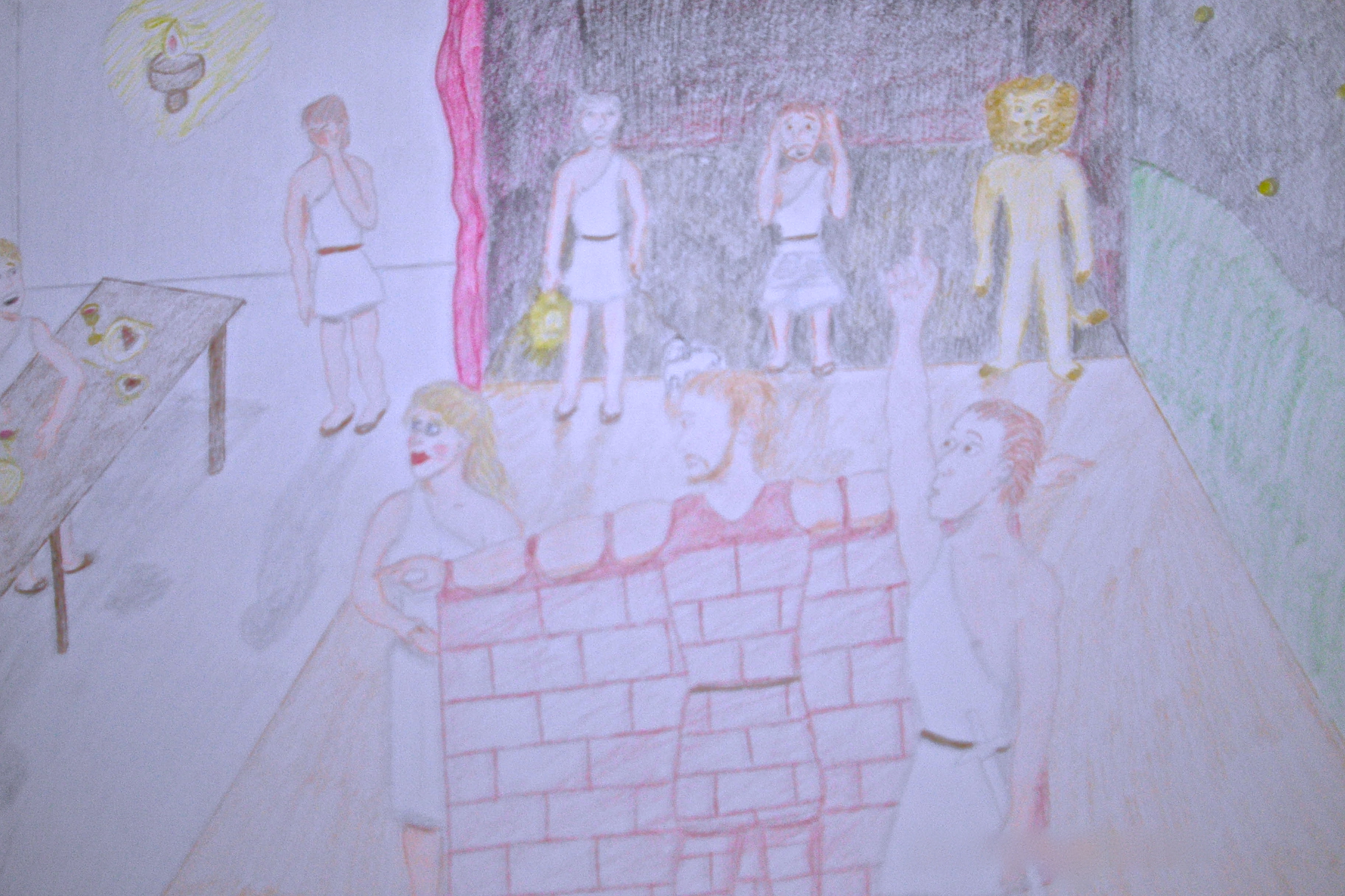 Quince gives a brief synopsis of the play: Pyramus would be with his lady Thisbe, but a wall separates the two lovers, and they can communicate only through a small hole in the wall; they agree to meet at Ninus’ Tomb; Thisbe arrives there first, but a Lion appears, and chases her; she gets away to safety, but only after a piece of her clothing is bitten and torn off, it being stained with the blood of a recent kill of the Lion’s. Pyramus arrives, and sees the bloody piece of Thisbe’s clothing; he assumes she’s dead, and kills himself. She returns, sees him dead, takes his sword, and kills herself, too. Then Quince tells the audience his actors will now act out the story. He leaves.