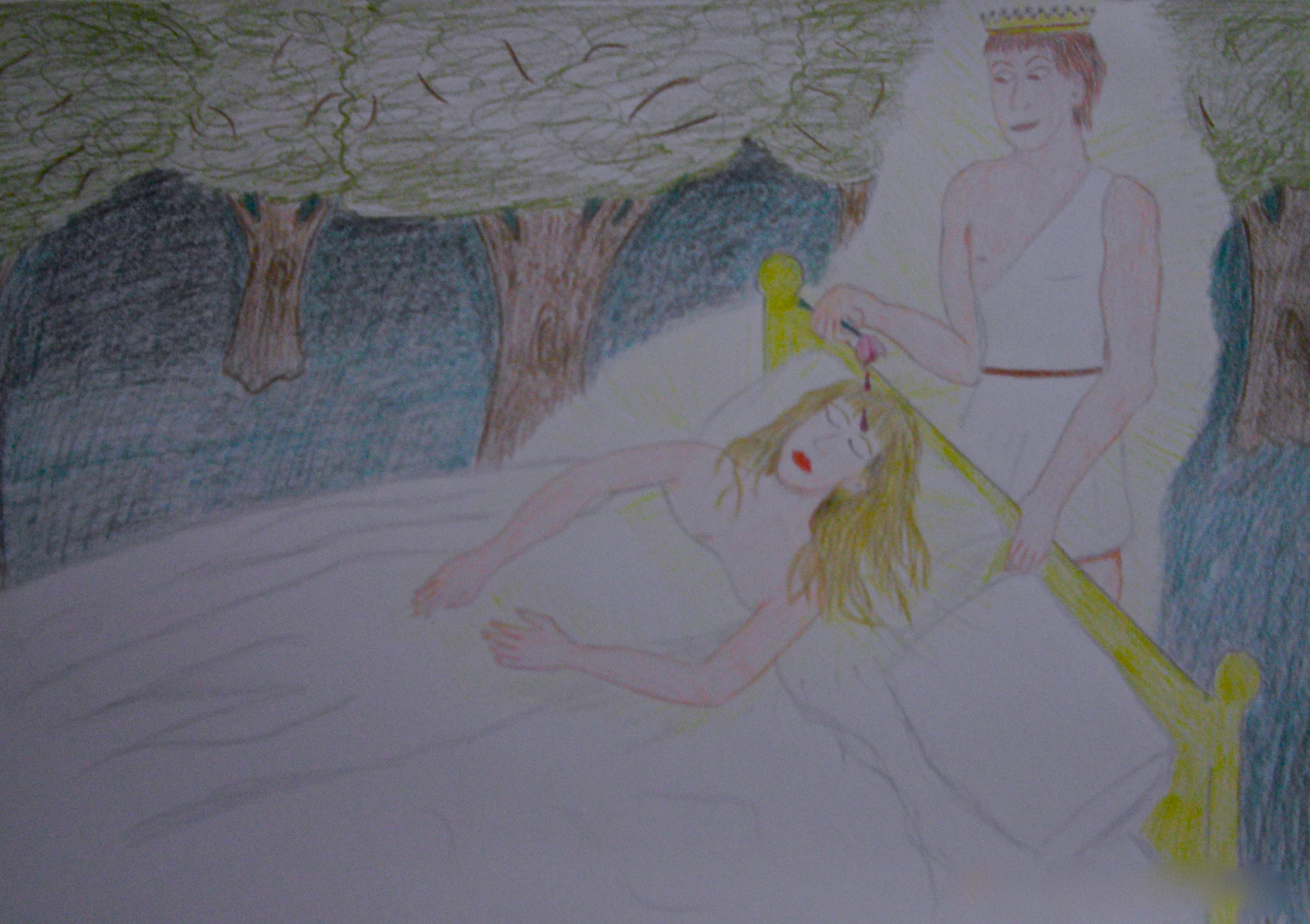 Meanwhile, Lysander and Hermia are wandering elsewhere in the forest, and they are tired and lost. They decide to sleep, Lysander’s hopes of getting close to Hermia disappointed when she, out of maidenly modesty, tells him to sleep further off. He does, and when Puck sees them asleep, he assumes that Lysander, in Athenian clothes and sleeping apart from the girl (presumably out of disdain for her), is the man Oberon wants Puck to use the love juice on. Puck pours it on Lysander’s eyelids and leaves them.