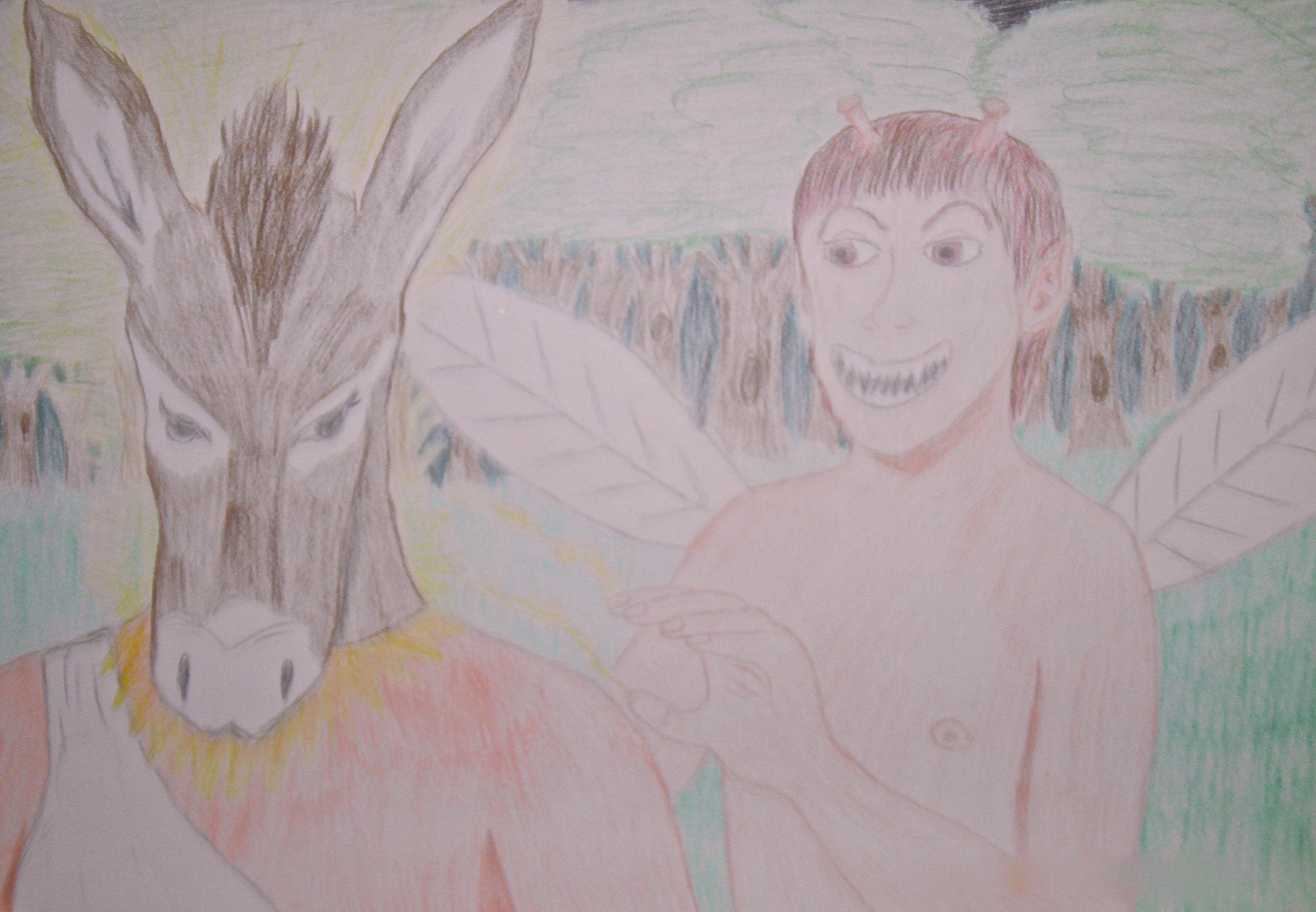 Bottom walks away momentarily. Puck has been watching all of the rehearsing, and he’s much amused by the actors’ lack of talent. He uses magic on Bottom, changing his head into that of a donkey. When Bottom returns to say his next words of love to Thisbe, all the other actors run away from him in terror at his ‘monstrous’ transformation.