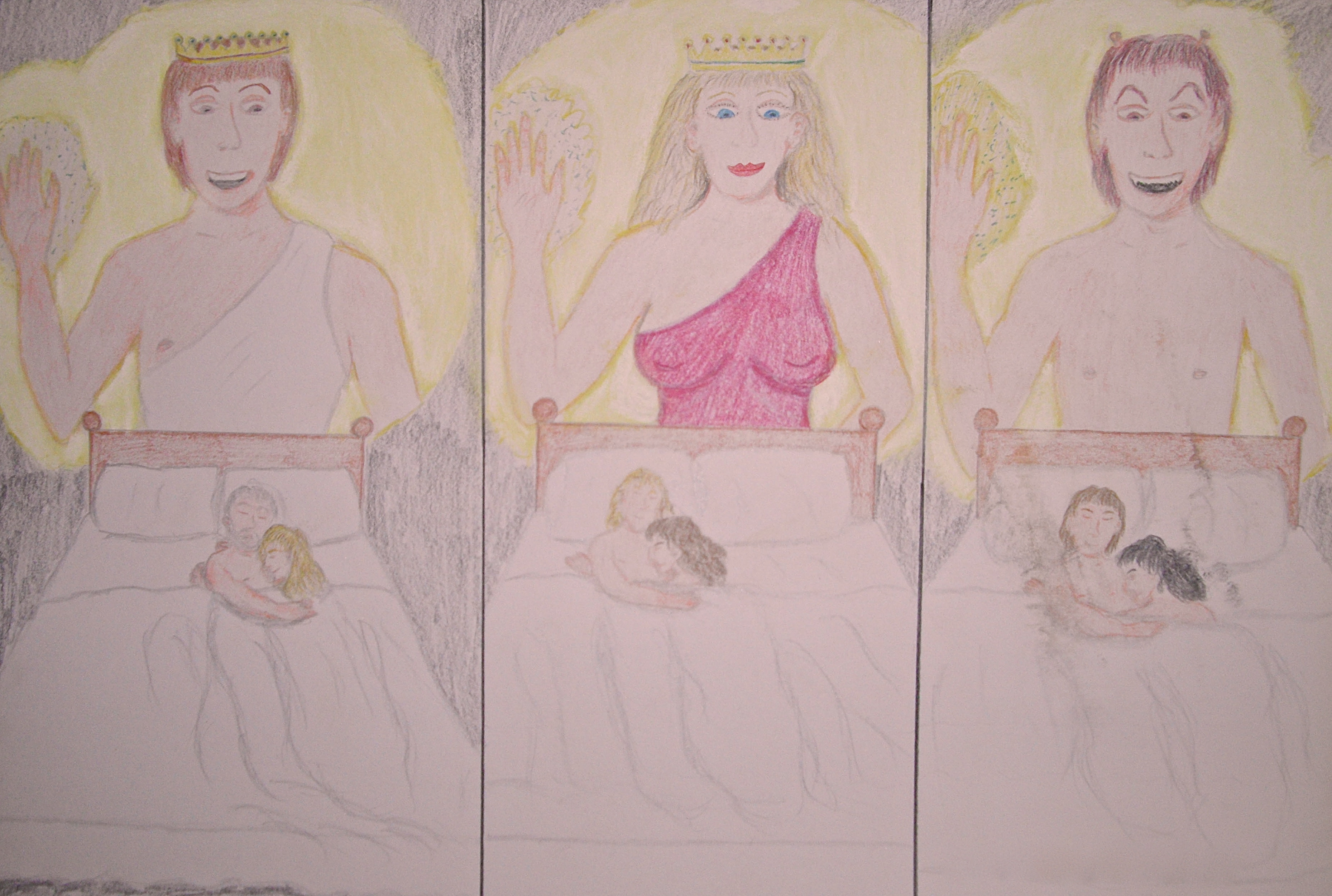 “Unh!” he gasped, waking up with a jerk. He looked around his dark surroundings nervously: under him, a soft, comfy bed; to his left, white curtains around a large window that let in just a little moonlight; in front, across from the foot of the bed was a mirror over a dresser drawer, allowing him to see the shadow of a reflection of himself; and to his right, a closet with folding doors. Immediately to the right of the head of the bed was a bedside table with an old Mickey Mouse telephone on it. A clock radio was beside the phone: it was about 4:25 am.
