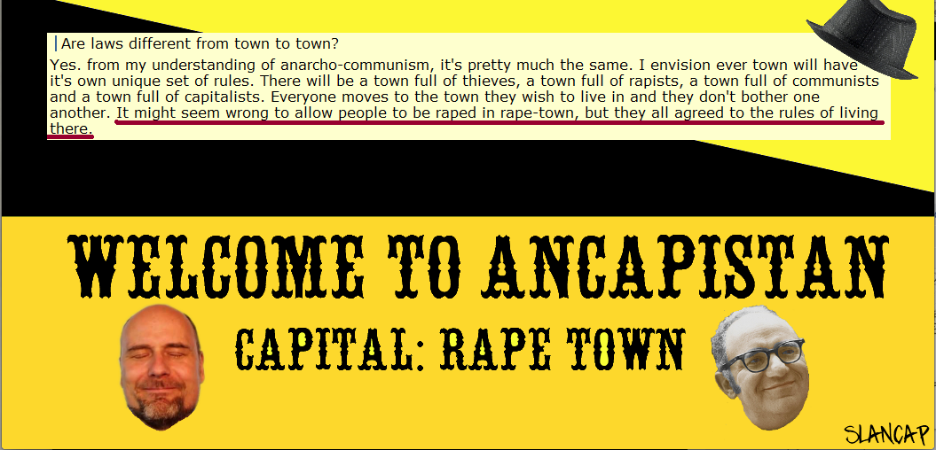 Just to give you an idea of how scary some ‘anarcho’-capitalists envision a stateless capitalist society, remarks were made on a page called ‘AnCap 101’ on Reddit.com: on the comments page answering the questions of ‘Left Anarchist here, can somebody give me some answers?’. Scroll down to where it says “Are laws different from town to town?” Thanks to SLANCAP for bringing this to my attention: